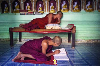 缅甸的孩子很小就会进入佛学院学习,小和尚们每日出门化缘,捧回信徒们的粥饭共食,他们盘腿坐在矮桌旁边,餐具就是自己的双手。寺院中的生活并不闭塞,不时可以看到僧人在操作电脑,在街上也能碰到身着红色袈裟的僧人骑着摩托掠过,留下绚丽的红色背影。