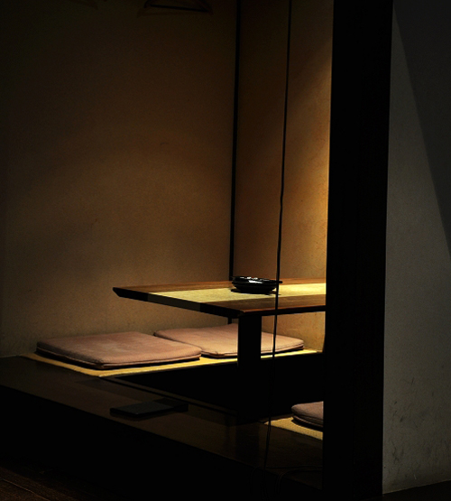 居酒屋本是让身心享受“轻松自由”的去处。“火间土”,便是新派和风居酒屋的代表。其独特魅力一方面在于通过京都小路风情为客人提供出舒适的空间享受,同时还带来视觉华丽却符合现代健康理念的创意料理。火间土的整体设计都是出自日本设计师之手,材料简单,但由砖角排列出的图案却极富立体感和现代感。另一方面,黑与白,粗糙与细腻,简单的材料也能搭配出不凡的效果,别有一番古朴的禅意。柱子围成一处四方天井,中央就是开放的大堂,围绕在四周的便是以“小路”命名的个个房间。类似经纬刻度的名称令所有一间院落的位置都非常明晰,如横坐标为“一条小路”、“二条小路”,而座落在每条路段上的房屋,便是“一条一”、“三条四”等顺序排列。火间土的菜系定位是“和风新派”,从取材、配料、装盘都更具现代感,同时更追求健康的美味。